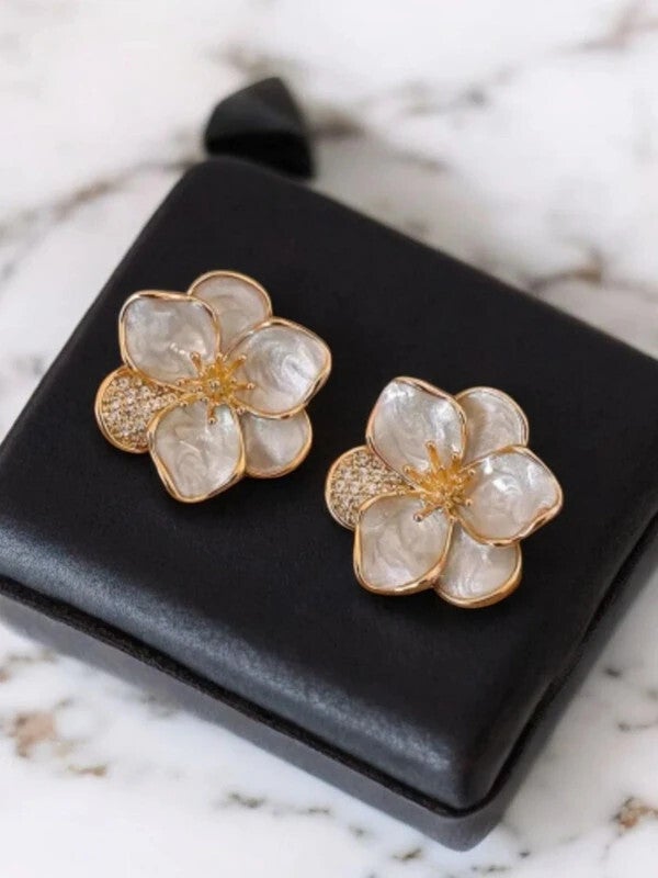 Laissez-vous séduire par ces boucles d’oreilles florales, alliance parfaite entre élégance et modernité. Chaque pièce représente une fleur à cinq pétales au fini nacré irisé, délicatement encadrée d’un contour doré brillant qui capte la lumière à chaque mouvement. Un micro‑pavé discret orne discrètement l’un des pétales, ajoutant une touche de scintillement raffinée sans jamais être ostentatoire. Le centre finement travaillé reproduit les détails d’un pistil doré pour un rendu délicat et réaliste.